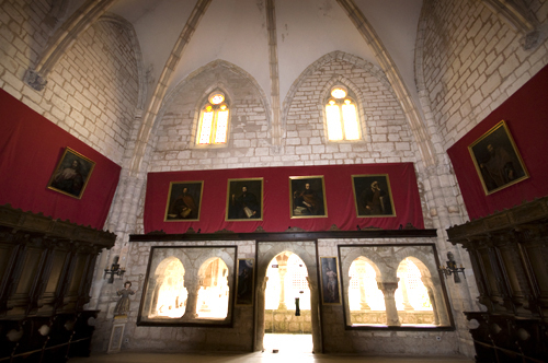 Por último la entrada desde la iglesia y la sacristía a la sala capitular es una portada de un arco de medio punto con adornos geométricos trilobulados en forma de greca que sobresale del vano y una arquivolta adornada por hojas de vid y uvas, con dos figuras infantiles en ambos extremos. En el interior de la sala adosados a los muros cuadros representando santos, y uno representando a los fundadores del CIster, Roberto, Alberico y Esteban.