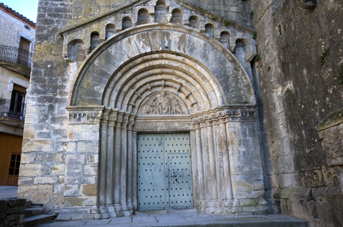 El acceso desde el exterior, se hace desde el otro brazo del crucero, con una puerta abocinada, con arquivoltas alternas de rodillos y sustentadas por columnas, con capiteles adornados con motivos geométricos mas elaborados los del lado izquierdo, y vegetales mas sencillos los del lado derecho. En el tímpano, una escultura de la virgen con el niño y dos ángeles en adoración que da al exterior donde se encuentran una serie de enterramientos.